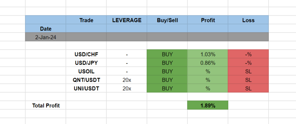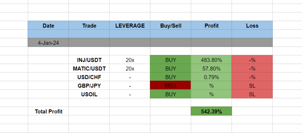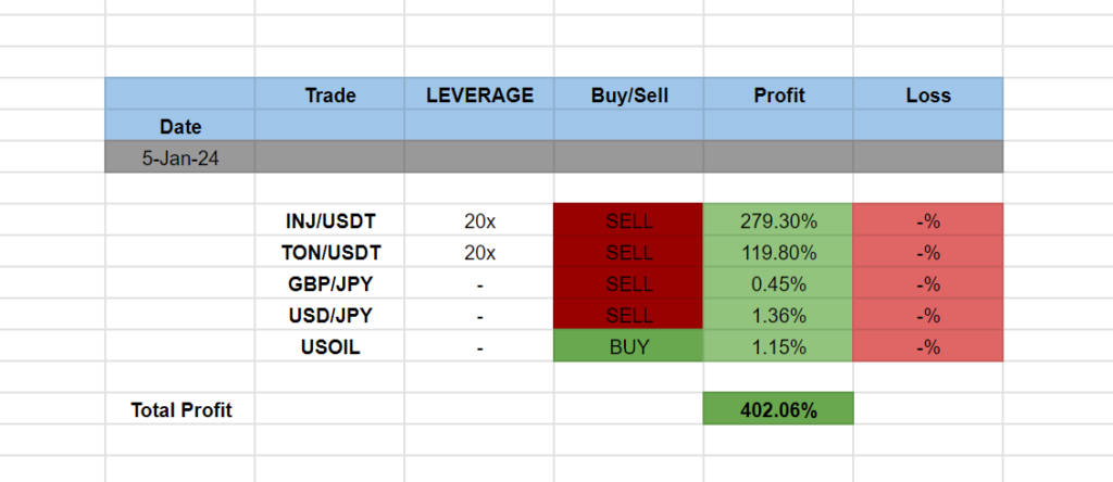 Between January 1st and 5th, the Income Mentor Box Signals Service demonstrated exceptional profitability in its cryptocurrency and Forex signals. Out of the 21 VIP trading signals released, an impressive 16 resulted in profitable trades, with only 5 trades reaching stop-loss levels.