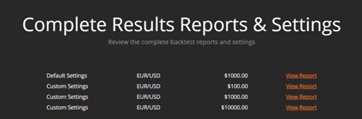 What you will see in this “Complete Results Reports & Settings”.section is one default setting and three custom settings. The important settings to pay attention to here are the custom settings. These custom settings are designed to minimize losses maximize your profits based on the amount of trading capital that you have, whether $100, $1,000, or $10,000.