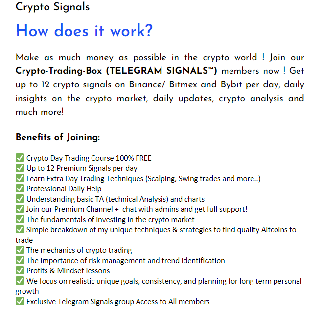 In layman’s terms, Crypto Trading Box is a cryptocurrency signals service. Simply put, it’s a service that runs over a free messaging app, where you get daily trading signals for various cryptocurrency pairs. All signals are researched and analyzed for quality. All that you have to do is take the signals as they appear, paste them into your exchange, broker, or trading platform of choice, and watch as they produce profits.
