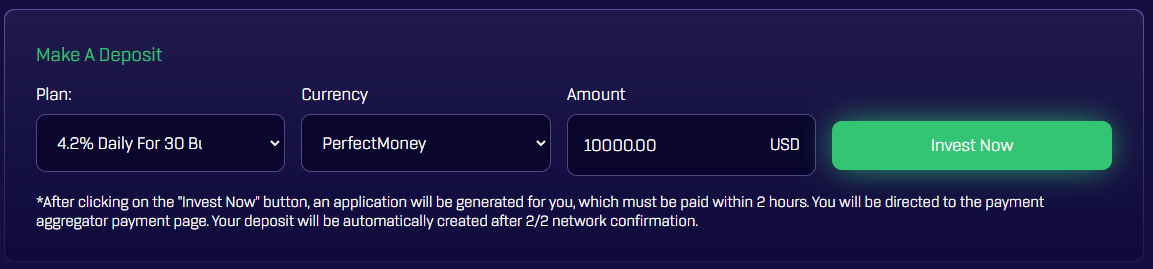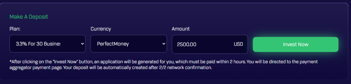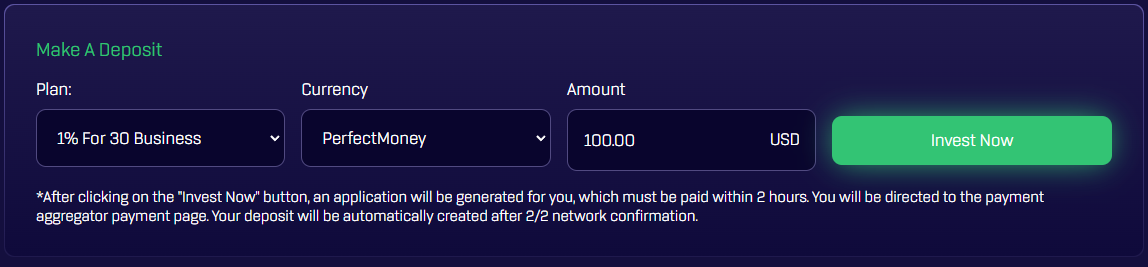 The first investment package that you can choose from here requires you to invest $100, and up to $2500. This will provide you with a 1% ROI on a daily basis, every day, for 30 days.