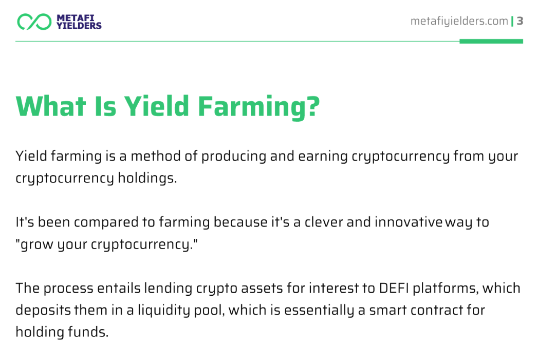 So, on that note, you now need to know what yield farming is. To put it in simplest terms, yield farming is a process where something like a cryptocurrency, is lent out to that decentralized finance system or platform. They then use those cryptocurrencies for their own purposes.